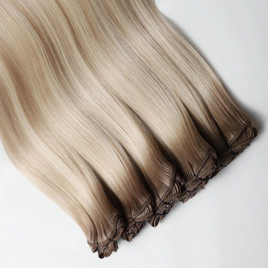 모발 유형 및 질감: 100% 레미 인모는 필수입니다. 자연스럽고 흐르는 듯한 움직임으로 잘못될 일이 없으며, 레미가 아닌 모발에 비해 엉키는 경향이 없습니다. 고객의 머리카락이 두꺼운 경우 삼중 위사 구조를 사용하는 것이 좋습니다. 확장 부분이 두피에 부피가 커지거나 불편함을 주지 않으면서 밀도를 높입니다.